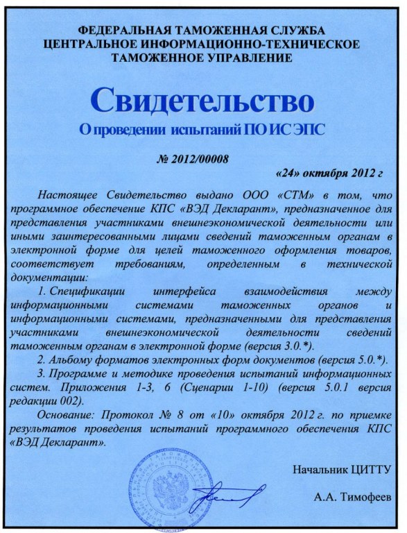 Поддерживает все официальные форматы ФТС России и позволяет работать в системе Электронного декларирования (свидетельство о проведении испытании ПО ИС ЭПС № 2012/00008 от 24 октября 2012).